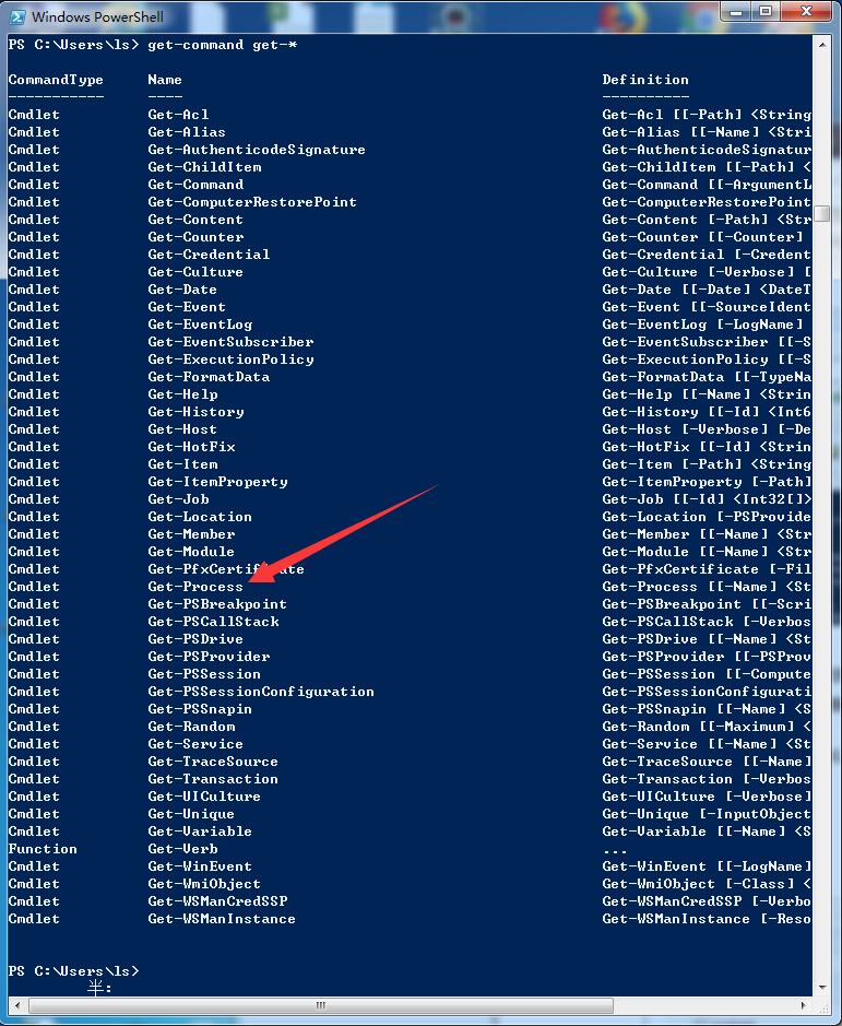 查看信息都是get-開頭,所以我們猜測查看進(jìn)程的命令也以get-開頭,執(zhí)行g(shù)et-command get-*試一下