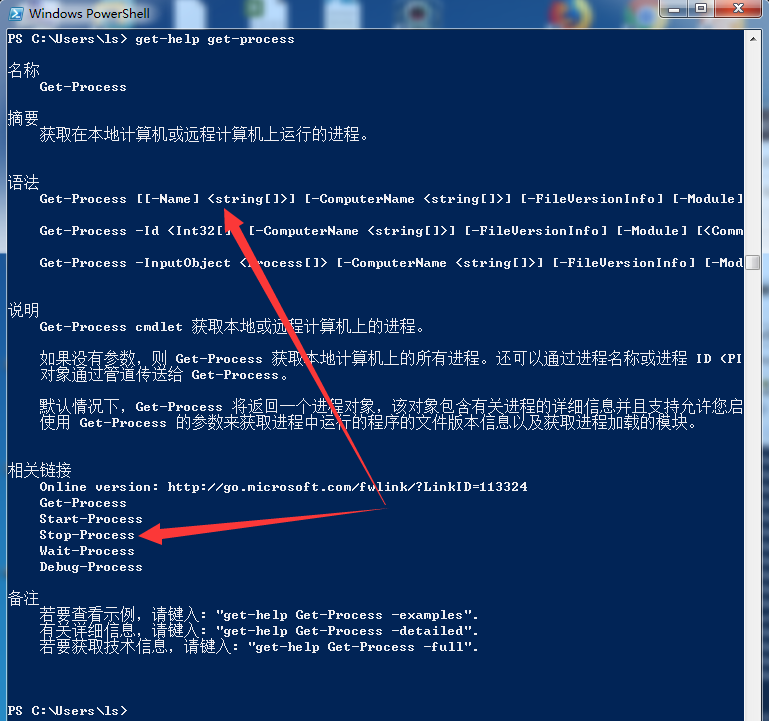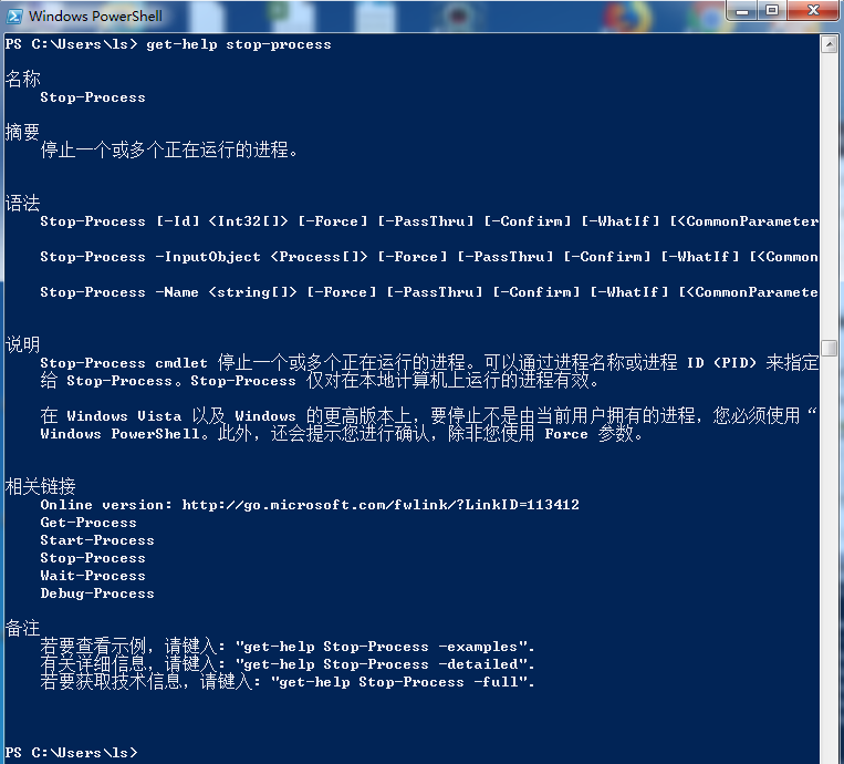 可以看到就5個(gè)命令,而其中只有stop-process比較像,一樣使用get-help來查看幫助順便確認(rèn)是不是