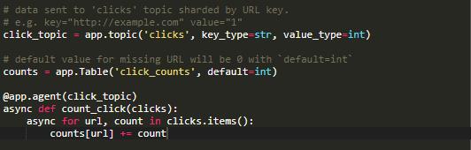 發(fā)送到Kafka topic的數(shù)據(jù)是分區(qū)的,這意味著點擊數(shù)將用URL的這種方式進行分片。因此,同一個URL的每個計數(shù)都會立刻被傳遞給同一個Faust worker實例。