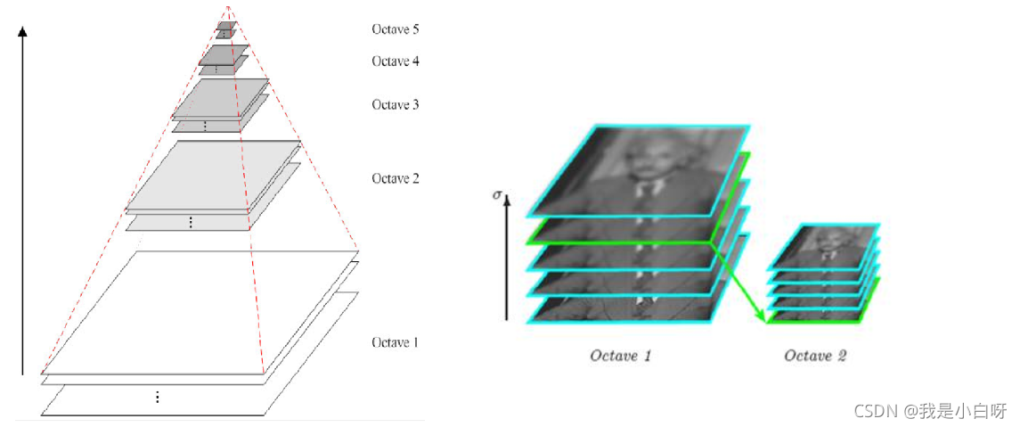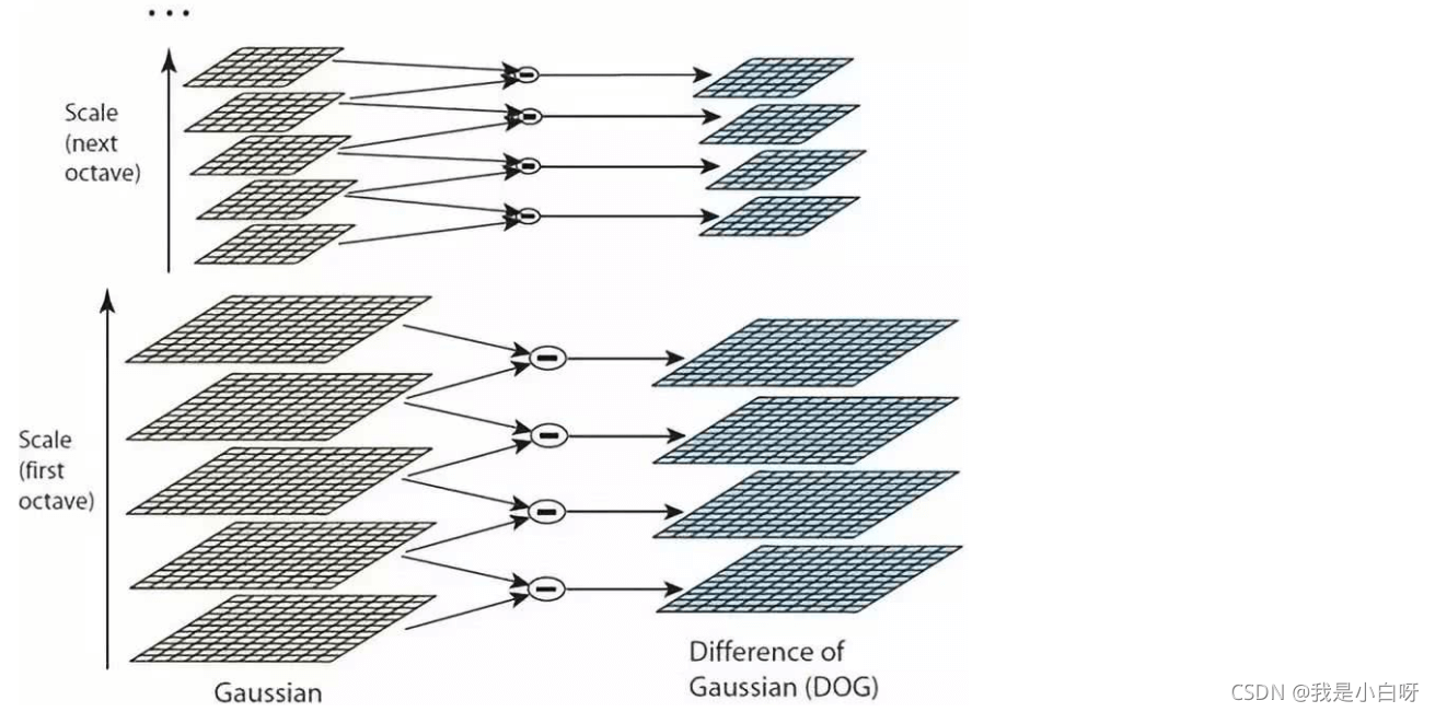 DoG (Difference of Gaussian) 即高斯差分金字塔, 是在高斯金字塔的基礎(chǔ)上構(gòu)建起來的. 通過對高斯金字塔逐層相減, 得到 t-1 的高斯差分金字塔: