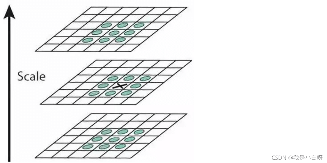 DoG 空間極值檢測: 將每個像素點和同一層周圍的 8 個像素點以及上下兩層的 18 個像素點, 共 26 個像素點進行比較. 如果一像素點大于或小于鄰近的 26 個像素點的時候, 就成為了極值點.