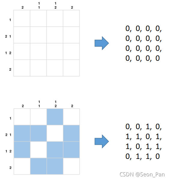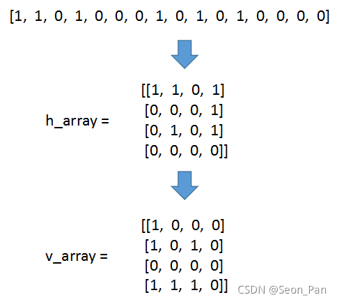 def get_w_remind(answer_lst): # 根據(jù)答案矩陣輸出提示列表 h_remind = [] v_remind = [] h_array = [answer_lst[i: i+size] for i in range(0, len(answer_lst), size)] # 橫向矩陣 for h in h_array: h_remind.append(get_line_remind(h)) v_array = list(map(list, zip(*h_array))) # 縱向矩陣 for v in v_array: v_remind.append(get_line_remind(v)) return h_remind, v_remind