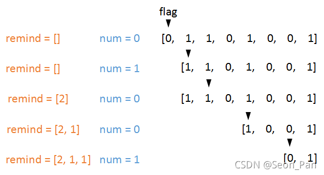 首先,準備一個列表類型的變量 remind 用于儲存多個提示數(shù)值,并準備一個位移標記 flag 用于記錄當(dāng)前是在答案陣列的哪一位進行判斷,以及一個數(shù)值記錄 num ,再將答案陣列 [0, 1, 1, 0, 1, 0, 0, 1] 傳入計數(shù)器。