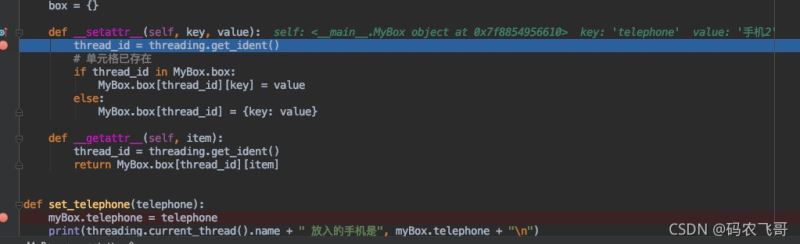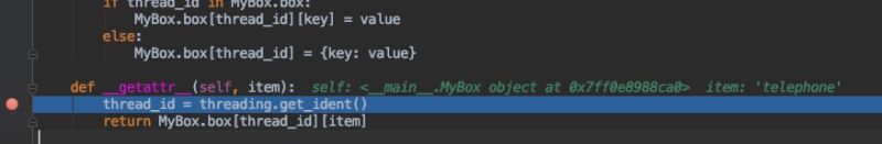 ,實際上會調(diào)用MyBox的__setattr__方法,參數(shù)key是telephone,參數(shù)value是"手機xx"。當調(diào)用myBox.telephone時實際上會調(diào)用__getattr__方法,傳入的參數(shù)item是telephone。取值時首先獲取當前線程ID。