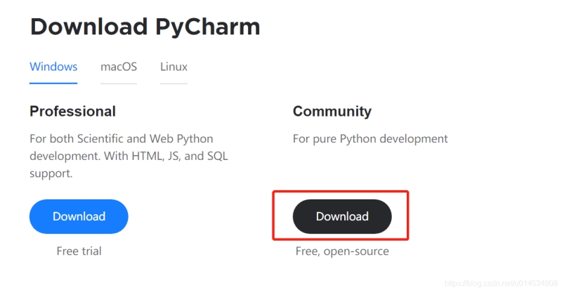 進(jìn)入下來(lái)頁(yè)面,PyCharm 有專業(yè)版和社區(qū)版。其中,專業(yè)版需要購(gòu)買才能使用,而社區(qū)版是免費(fèi)的。社區(qū)版對(duì)于日常的Python開(kāi)發(fā)完全夠用了。所以我們選擇PyCharm的社區(qū)版進(jìn)行下載安裝。點(diǎn)擊如下圖所示的按鈕進(jìn)行安裝包的下載。