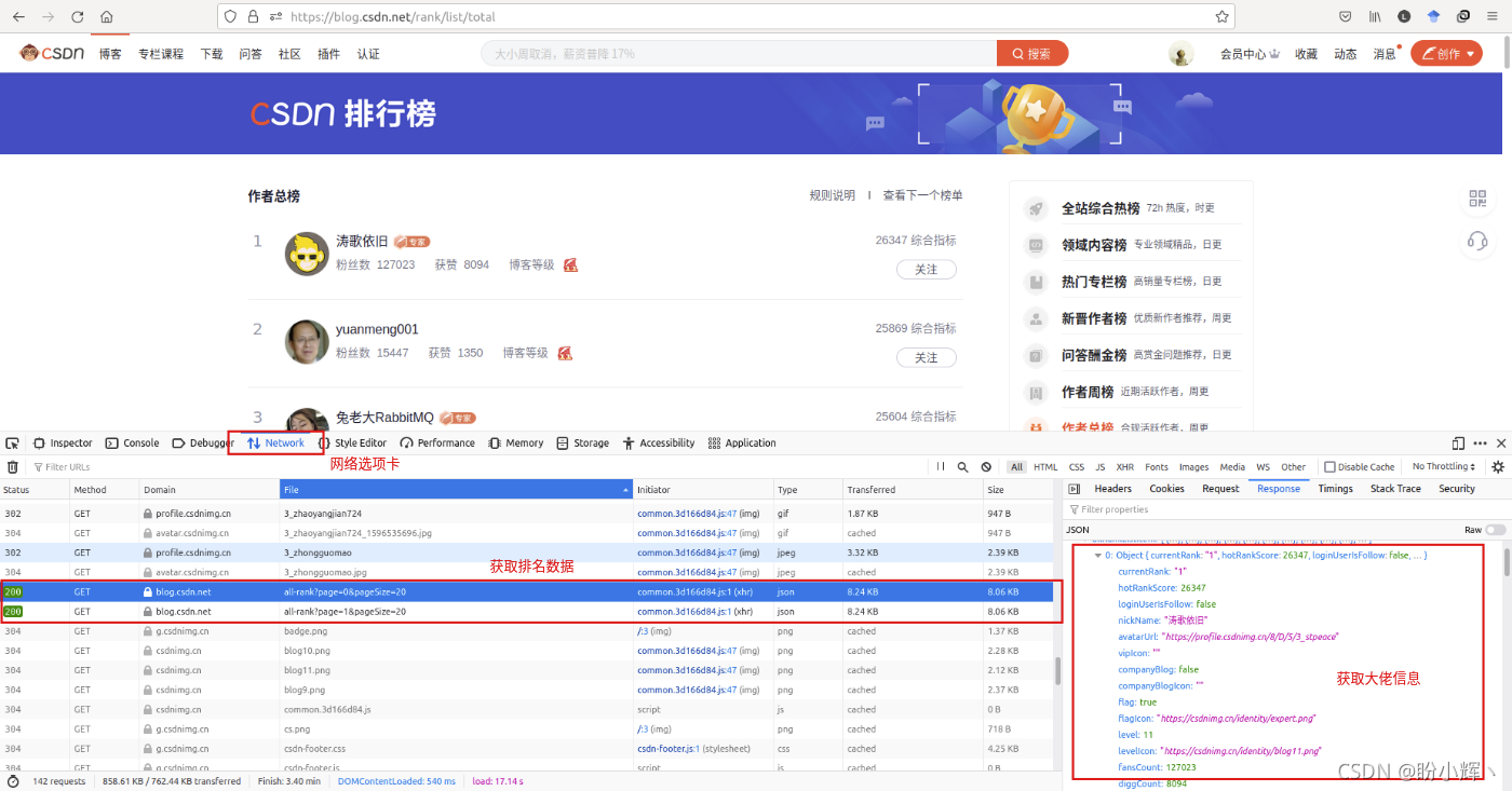 首先,我們需要獲取 CSDN 中在榜的大佬,獲取他/她們的相關(guān)信息。由于數(shù)據(jù)是動態(tài)加載的 (因此使用開發(fā)者工具,在網(wǎng)絡(luò)選項卡中可以找到請求的 JSON 數(shù)據(jù):