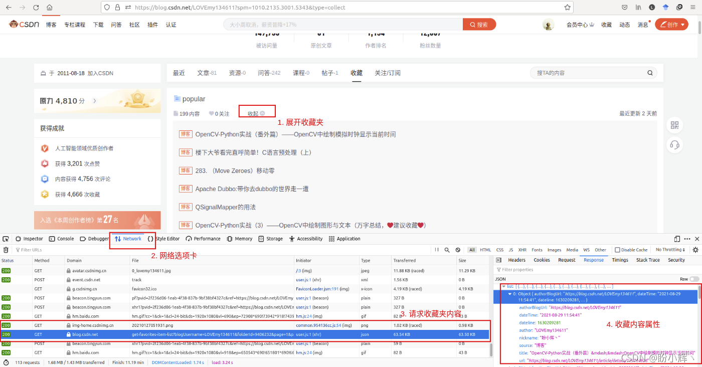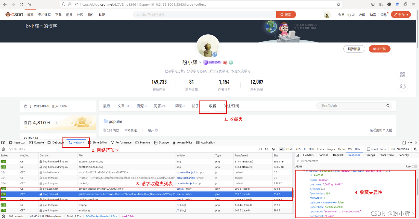 獲取到大佬的 userName 信息后,通過主頁來觀察收藏夾列表的請求方式,本文以自己的主頁為例(給自己推廣一波),分析方法與上一步類似,在主頁中切換到“收藏”選項卡,同樣利用開發(fā)者工具的網(wǎng)絡(luò)選項卡: