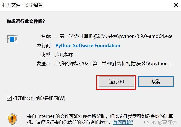 a、雙擊啟動(dòng)安裝程序, 在如下彈窗上點(diǎn)擊【運(yùn)行】,系統(tǒng)打開(kāi)安裝程序。