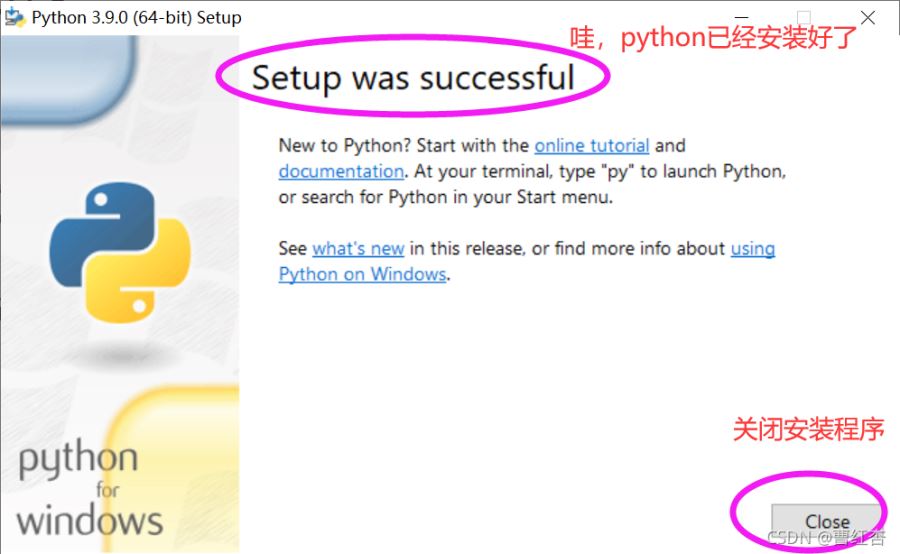 當(dāng)出現(xiàn)下面的窗口,就說(shuō)明你已經(jīng)成功安裝了python,點(diǎn)擊【close】結(jié)束安裝。