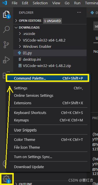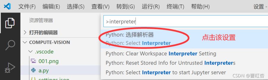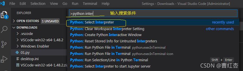 打開(kāi)命令選項(xiàng)板(Ctrl + Shift + P)選擇Python 3解釋器,開(kāi)始鍵入Python:select inter命令進(jìn)行搜索,然后選擇命令。
