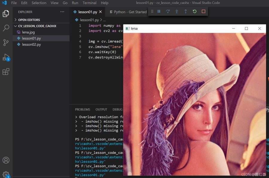 注意:請(qǐng)確保執(zhí)行前你已經(jīng)將lena,jpg文件放到該py文件所在的目錄,否則則會(huì)由于找不到文件而打開(kāi)失敗。