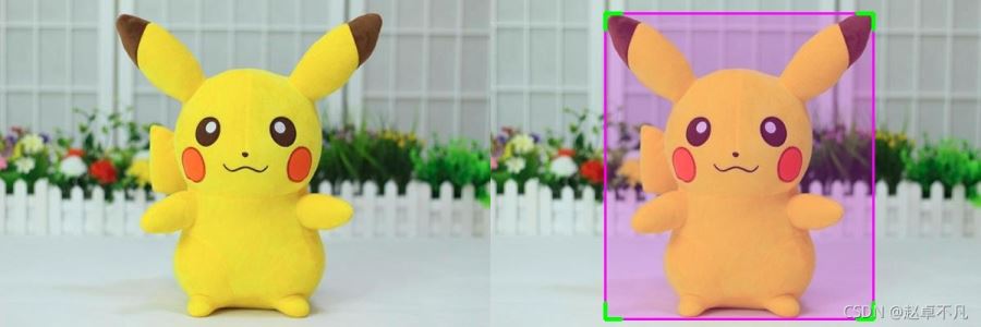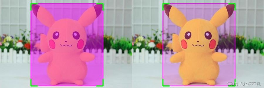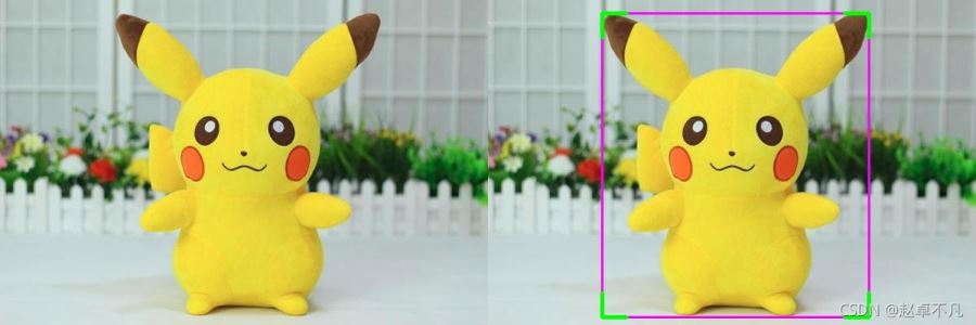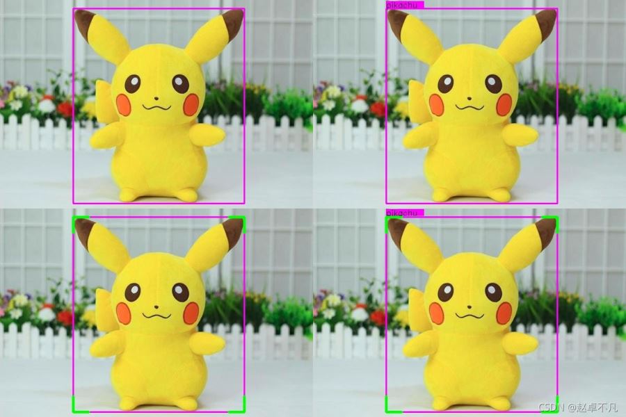 我們以上圖皮卡丘的矩形檢測框為例,左上為我們常用的不帶標(biāo)簽的輸出框,右上為YOLO系列美化帶標(biāo)簽后的矩形框,左下為四個角點美化后的矩形框,右下為帶標(biāo)簽的角點美化矩形框.