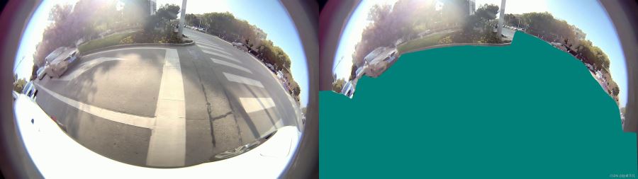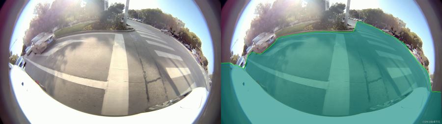 左側(cè)為我們輸入分割網(wǎng)絡(luò)的原始圖像,右側(cè)為我們分割網(wǎng)絡(luò)可行駛區(qū)域的推理圖,我們使用alpha=0.6對上述兩幅圖進行加權(quán),得到結(jié)果如下: