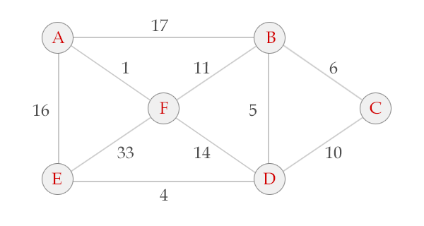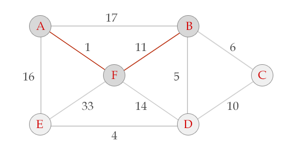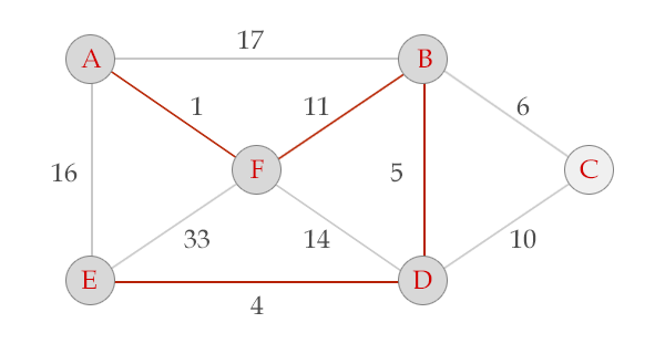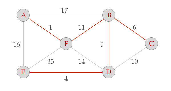 選中邊BC, V = {A, B, F, D, E, c}, E = {(A,F), (F,B), (B,D), (D,E), (B,C)}, 算法結束。