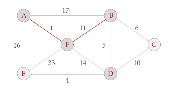 選中邊BD, V = {A, B, F, D}, E = {(A,F), (F,B), (B,D)}