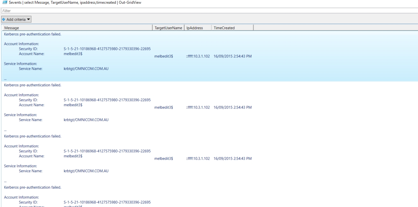 $events | select Message, TargetUserName, ipaddress,timecreated | Out-GridView