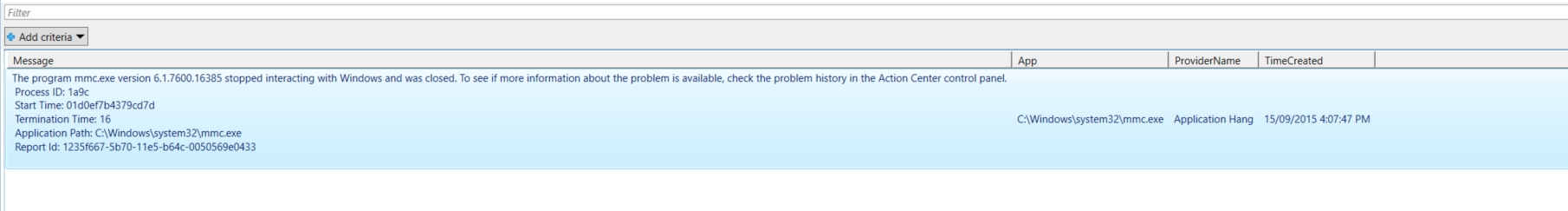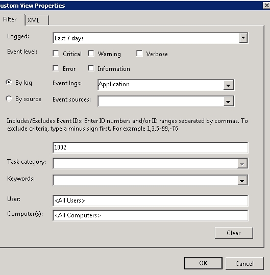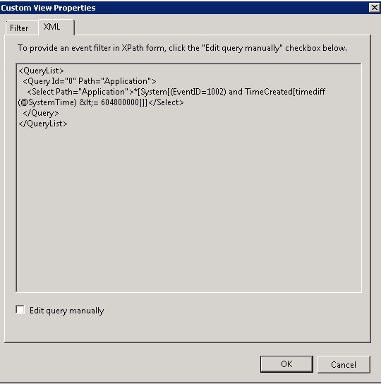 <Select Path="Application">*[System[(EventID=1002) and TimeCreated[timediff(@SystemTime) <= 604800000]]]</Select>