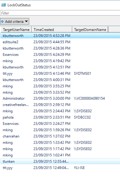 $events | select TargetUserName,timecreated, targetdomainname | Out-GridView -Title LockOutStatus