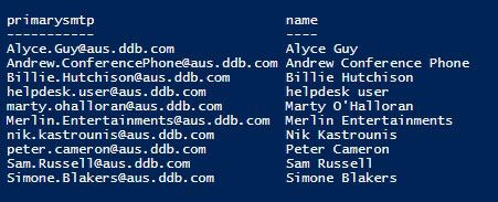 $result | Where-Object{$_.primarysmtp -like "*aus.ddb.com*"} | sort Name