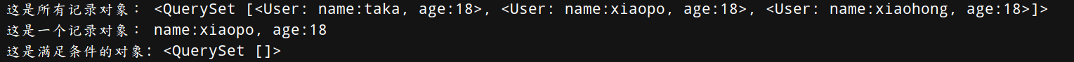 print("這是所有記錄對(duì)象:",rs1) #通過(guò)觀察,可以發(fā)現(xiàn)查詢(xún)到的記錄對(duì)象的輸出方式就是模型中的__str__的格式.