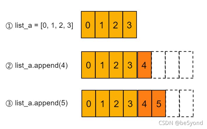 如下圖所示, list_a 長(zhǎng)度為4, 當(dāng)執(zhí)行 append(4) 時(shí), 底層的數(shù)據(jù)長(zhǎng)度其實(shí)申請(qǐng)了4個(gè)元素的空間,當(dāng)再次執(zhí)行 append(5) 的時(shí)候,不需要再次申請(qǐng)內(nèi)存。