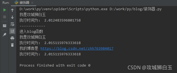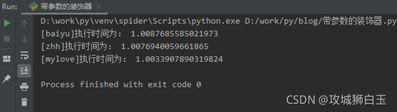 咱們基于原來(lái)的count_time函數(shù)外部再包一層用于接收參數(shù)的count_time_args,接收回來(lái)的參數(shù)就可以直接在內(nèi)部的函數(shù)里面調(diào)用了。上述代碼執(zhí)行效果如下: