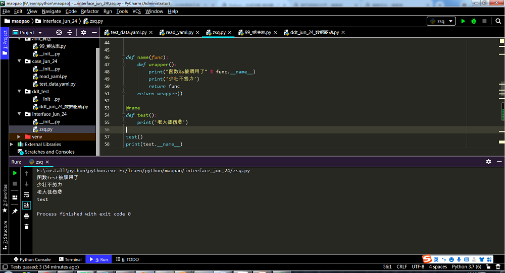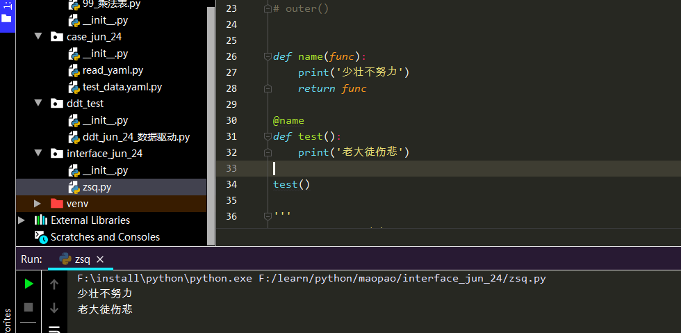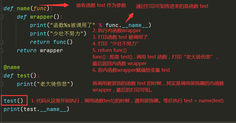 想要實現(xiàn)一個功能,在不改變 test 函數(shù)內(nèi)部結(jié)構(gòu)的前提下,在前面加一句 “少壯不努力”