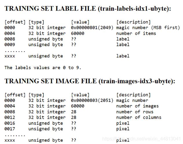上圖是訓(xùn)練集的label和image數(shù)據(jù)的存儲(chǔ)格式。兩個(gè)文件最開始都有magic number和number of images/items兩個(gè)數(shù)據(jù),有用的是第二個(gè),表示文件中存儲(chǔ)的樣本個(gè)數(shù)。另外要注意的是數(shù)據(jù)的位數(shù),有32位整型和8位整型兩種。