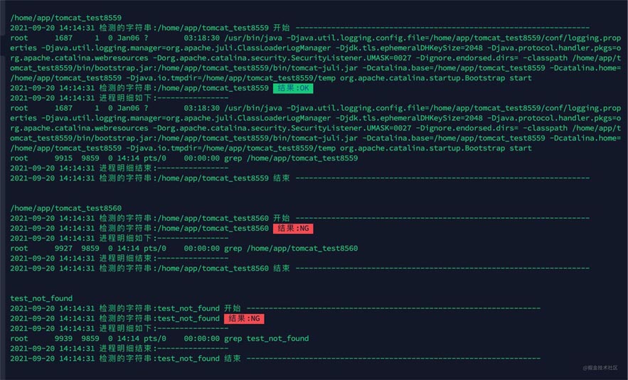 echo "$(date '+%Y-%m-%d %H:%M:%S') 檢測的字符串:$processString 結(jié)束 ------------------------------------------------------------------ "