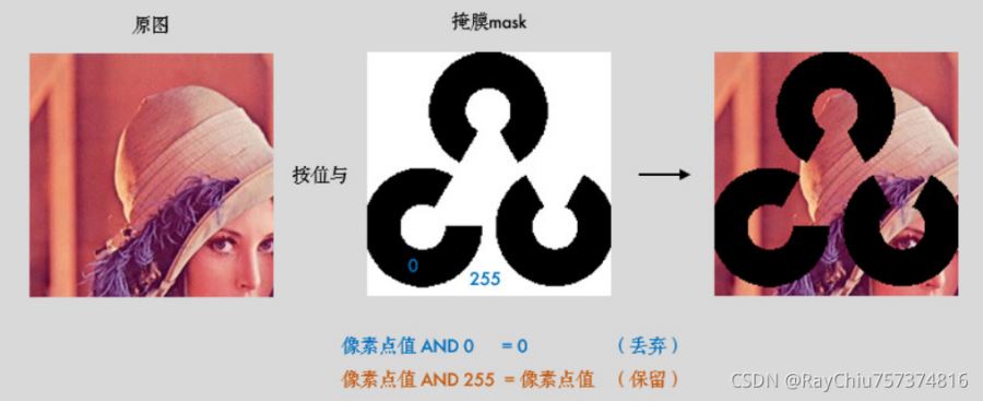 如果將兩幅圖片直接相加會改變圖片的顏色,如果用圖像混合,則會改變圖片的透明度,所以我們需要 用按位操作。 首先來了解一下 掩膜(mask) 的概念:掩膜是用一副二值化圖片對另外一幅圖片進行局 部的遮擋,看下圖就一目了然了: