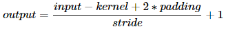 假設(shè)圖像的尺寸是 input x input,卷積核的大小是kernel,填充值為padding,步長為stride,卷積后輸出的尺寸為output x output,則卷積后,尺寸的計算公式為: