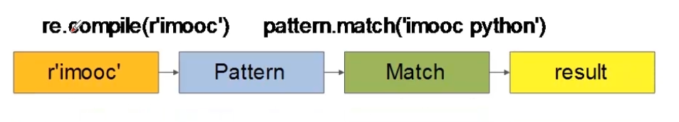 匹配過程:r'imooc'是原字符串,先生成Pattern對象,從頭開始找,得到一個Match(或Search等)實例,最后有一個匹配結果。