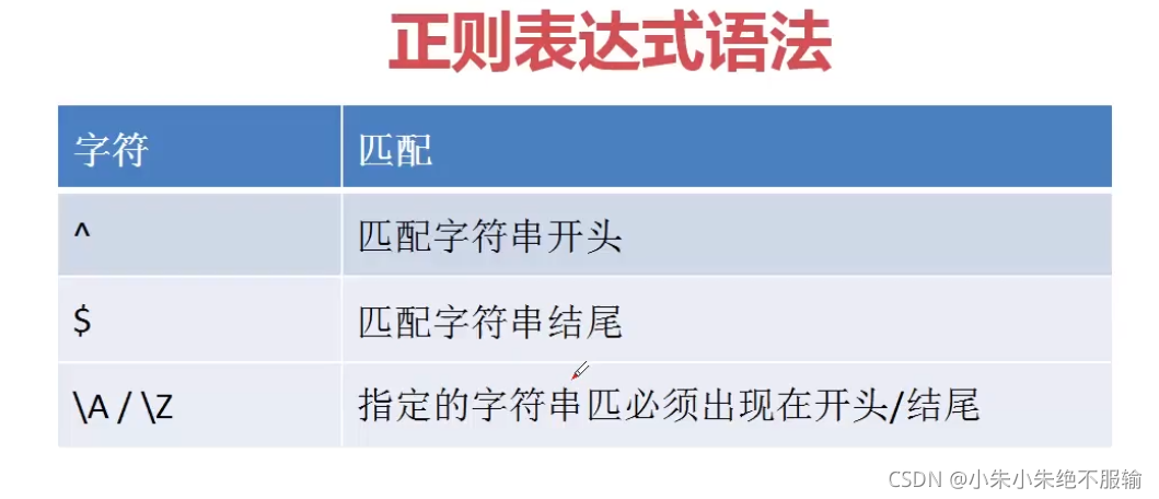# 指定開頭結尾 ma = re.match(r'\Aimooc[\w]*', 'imoocpython') print(ma.group()) ma = re.match(r'\Aimooc[\w]*', 'iimoocpython') print(ma.group()) # 匹配不到 imoocpython