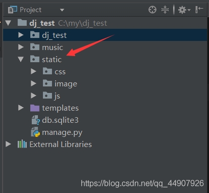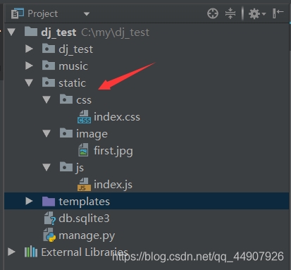 在項(xiàng)目目錄下創(chuàng)建static目錄, 為了區(qū)分開各種類型的靜態(tài)文件,再分別創(chuàng)建css,image,js文件目錄: