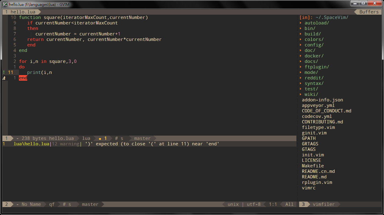 SpaceVim 是一個(gè)模塊化的 Vim IDE,針對(duì) lua 這一語(yǔ)言的支持主要依靠 lang#lua 模塊以及與之相關(guān)的其它模塊。 的這篇文章主要介紹如何使用 SpaceVim 搭建 lua 的開(kāi)發(fā)環(huán)境,側(cè)重介紹跟 lua 開(kāi)發(fā)相關(guān)使用技巧。 在閱讀這篇文章之前,可以先來(lái)看看使用 Vim 搭建基礎(chǔ)的開(kāi)發(fā)環(huán)境,對(duì)語(yǔ)言相關(guān)以外的功能有一個(gè)大致的了解。