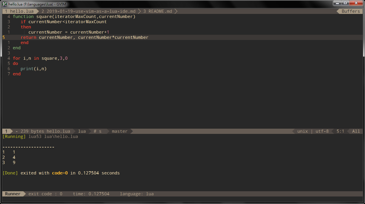 在編輯 lua 文件時(shí),可以快速運(yùn)行當(dāng)前文件,這個(gè)功能有點(diǎn)類(lèi)似于 vscode 的 code runner 插件,默認(rèn)的快捷鍵是 SPC l r。按下后, 會(huì)在屏幕下方打開(kāi)一個(gè)插件窗口,運(yùn)行的結(jié)果會(huì)被展示在窗口內(nèi)。于此同時(shí),光標(biāo)并不會(huì)跳到該插件窗口,避免影響編輯。在這里需要說(shuō)明下, 這一功能是根據(jù)當(dāng)前文件的路徑調(diào)用相對(duì)應(yīng)的 lua 命令。因此,在執(zhí)行這個(gè)快捷鍵之前,應(yīng)當(dāng)先保存一下該文件。