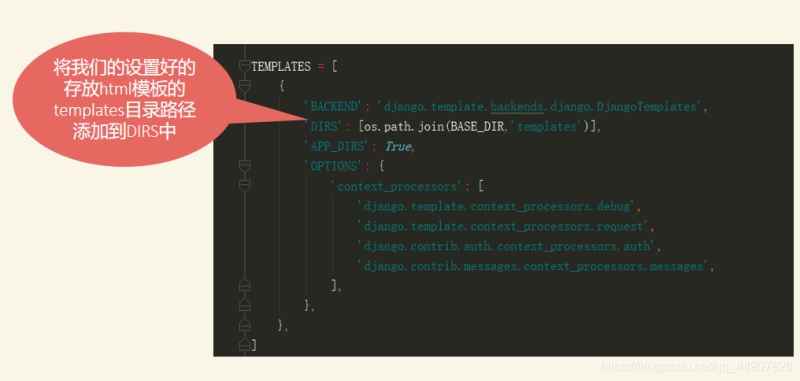 注意:如果是使用pycharm創(chuàng)建的django項目,templates目錄路徑是已經添加到DIRS中了哦!