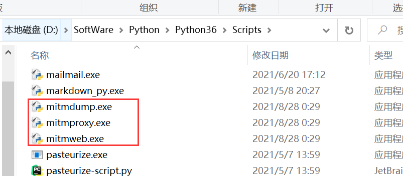 安裝成功后在Python安裝路徑Script路徑下可以找到 mitmdump.exe 、mitmproxy.exe 、mitmweb.exe 這三個(gè)可執(zhí)行文件。