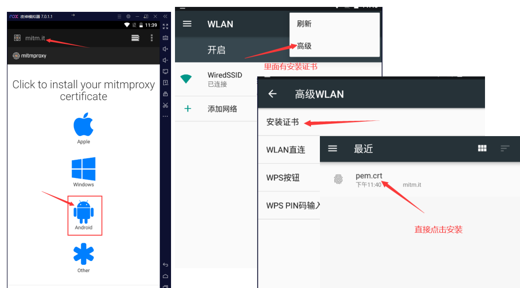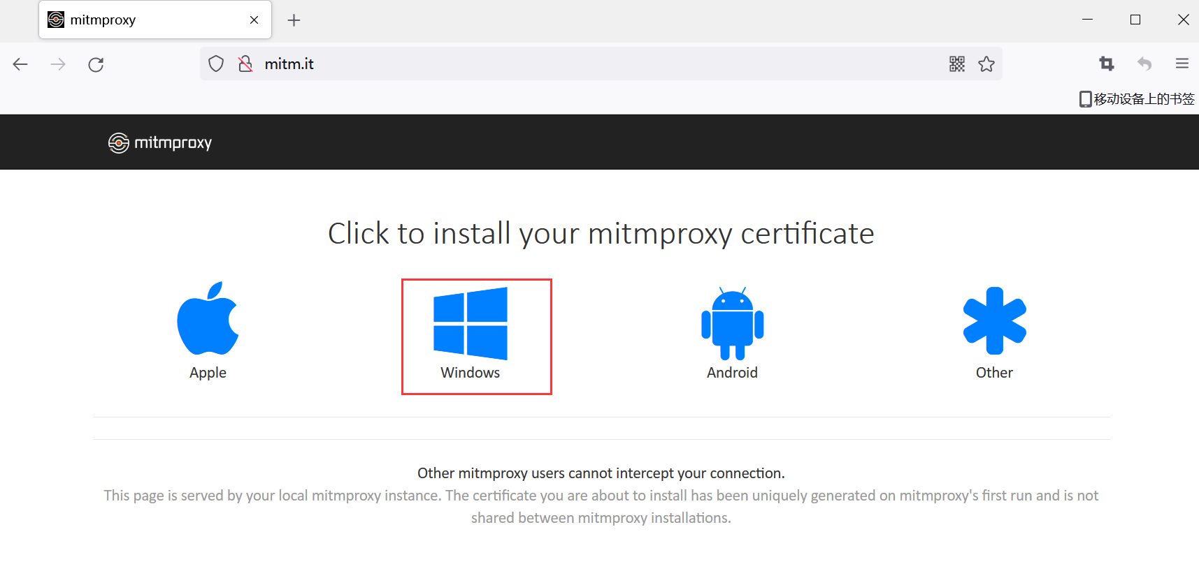 在代理狀態(tài)下,訪問(wèn)http://mitm.it/,PC端與移動(dòng)端操作相同。