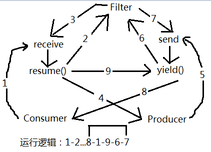 圖畫的不太好,可以先將Filter遮住,它是過濾器對(duì)兩個(gè)程序之間傳遞的信息進(jìn)行處理。去掉Filter邏輯就更清晰些了,就是兩個(gè)“線程”(其實(shí)是兩個(gè)協(xié)同程序)互相調(diào)用。resume回到y(tǒng)ield處開始,支持嵌套,返回到棧頂?shù)膟ield位置。yield是非阻塞的“線程同步”。這到有點(diǎn)像linux里的管道通信。