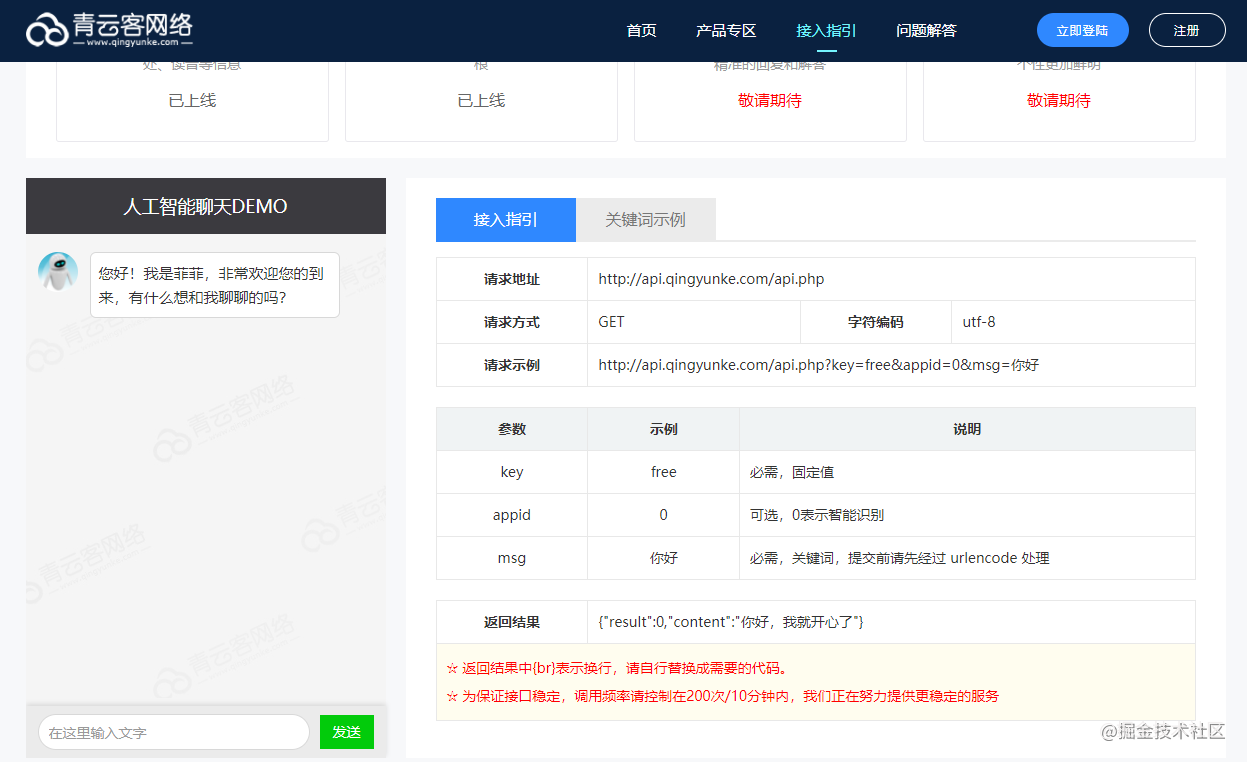 青云客機(jī)器人:青云客機(jī)器人,這個(gè)機(jī)器人好像叫菲菲,無(wú)所謂,主要可以白嫖,不用登陸,可以直接調(diào)用接口。