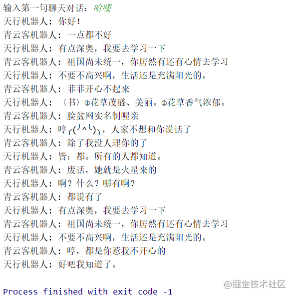 效果達(dá)成,雖然兩個(gè)機(jī)器人都不是很智能,但至少還是實(shí)現(xiàn)了基本的聊天對(duì)話功能,有人可能會(huì)說(shuō),這不就是調(diào)第三方接口嘛,說(shuō)的也對(duì),主要就是調(diào)用了第三方接口,雖然代碼很簡(jiǎn)單,邏輯也不難,但是還是挺有意思的。有調(diào)用智能機(jī)器人的需求的話,也可以看看上面介紹的產(chǎn)品。