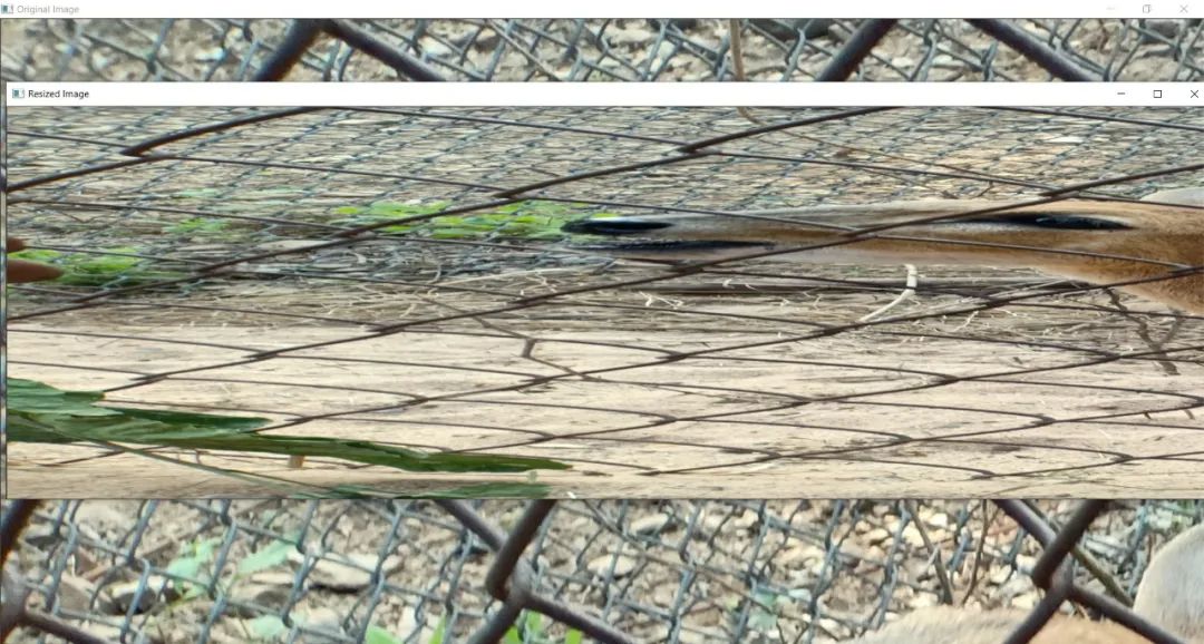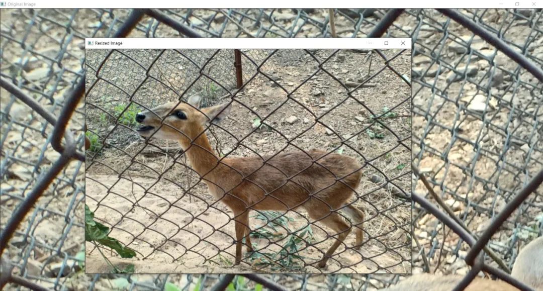 import cv2 img = cv2.imread(‘images/deer.JPG') new_dim = (450, 450) resized_img = cv2.resize(img, new_dim, interpolation=cv2.INTER_AREA) cv2.imshow(“Original Image”, img) cv2.imshow(“Resized Image”, resized_img) cv2.waitKey(0) cv2.destroyAllWindows()