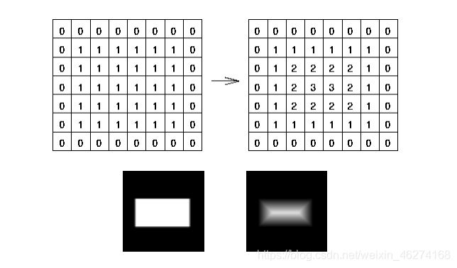 距離變換 (Distance Transform)通過計算圖像中非零像素點到最近像素的距離, 實現(xiàn)了像素與圖像區(qū)域的距離變換.