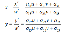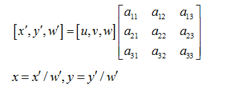 上述公式中,u,v代表原始圖像坐標(biāo),x,y為經(jīng)過透視變換的圖片坐標(biāo),其中變換矩陣為3X3形式。進(jìn)而可以得到: