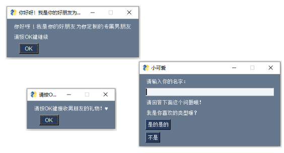 sg.popup('你好呀!我是你的好朋友為你定制的專屬男朋友','請(qǐng)按OK鍵繼續(xù)') #這是一個(gè)簡(jiǎn)易彈框