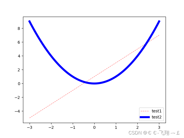 def matplotlib_legend(): x = np.linspace(-3, 3, 100) y1 = 2 * x + 1 y2 = x ** 2 # 平方 l1, = plt.plot(x, y1, color="red", linewidth=1.0, linestyle='--', alpha=0.5) l2, = plt.plot(x, y2, color="blue", linewidth=5.0, linestyle='-') # handles里面?zhèn)魅胍a(chǎn)生圖例的關(guān)系線,labels中傳入對應(yīng)的名稱, # loc='best'表示自動選擇最好的位置放置圖例 plt.legend(handles=[l1, l2], labels=['test1', 'test2'], loc='best') plt.show()