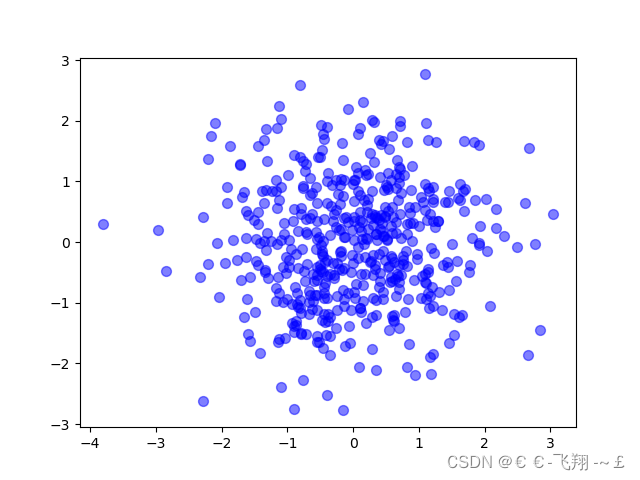 def matplotlib_scatter(): plt.figure() plt.scatter(np.arange(5), np.arange(5)) # 安排兩個0到4的數(shù)組繪制 x = np.random.normal(0, 1, 500) # 正態(tài)分布的500個數(shù) y = np.random.normal(0, 1, 500) plt.figure() plt.scatter(x, y, s=50, c='b', alpha=0.5) plt.show()