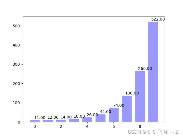 def matplotlib_bar(): x = np.arange(10) y = 2 ** x + 10 # facecolor塊的顏色,edgecolor塊邊框的顏色 plt.bar(x, y, facecolor='#9999ff', edgecolor='white') # 設(shè)置數(shù)值位置 for x, y in zip(x, y): # zip將x和y結(jié)合在一起 plt.text(x + 0.4, y, "%.2f" % y, ha='center', va='bottom') plt.show()
