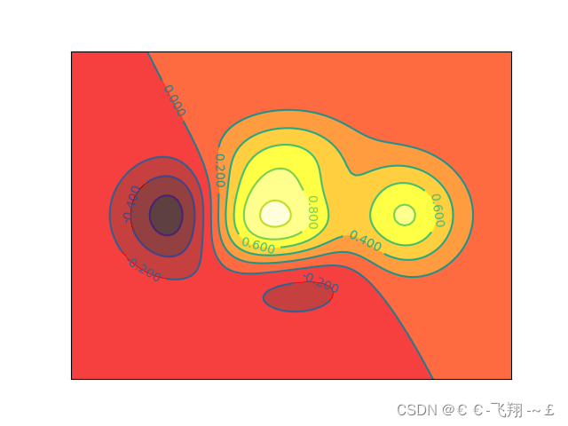 def matplotlib_contours(): def f(a, b): return (1 - a / 2 + a ** 5 + b ** 3) * np.exp(-a ** 2 - b ** 2) x = np.linspace(-3, 3, 100) y = np.linspace(-3, 3, 100) X, Y = np.meshgrid(x, y) # 將x和y傳入一個網(wǎng)格中 # 8表示條形線的數(shù)量,數(shù)量越多越密集 plt.contourf(X, Y, f(X, Y), 8, alpha=0.75, cmap=plt.cm.hot) # cmap代表圖的顏色 C = plt.contour(X, Y, f(X, Y), 8, color='black', linewidth=.5) plt.clabel(C, inline=True, fontsize=10) plt.xticks(()) plt.yticks(()) plt.show()